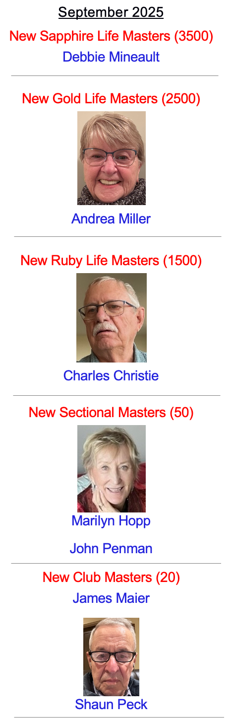 This page keeps a record of Unit 431 members who attain new masterpoint ranks (rank requirement shown in brackets). It is updated monthly and the current year is shown. For older milestones, click on the year of your choice, below.
