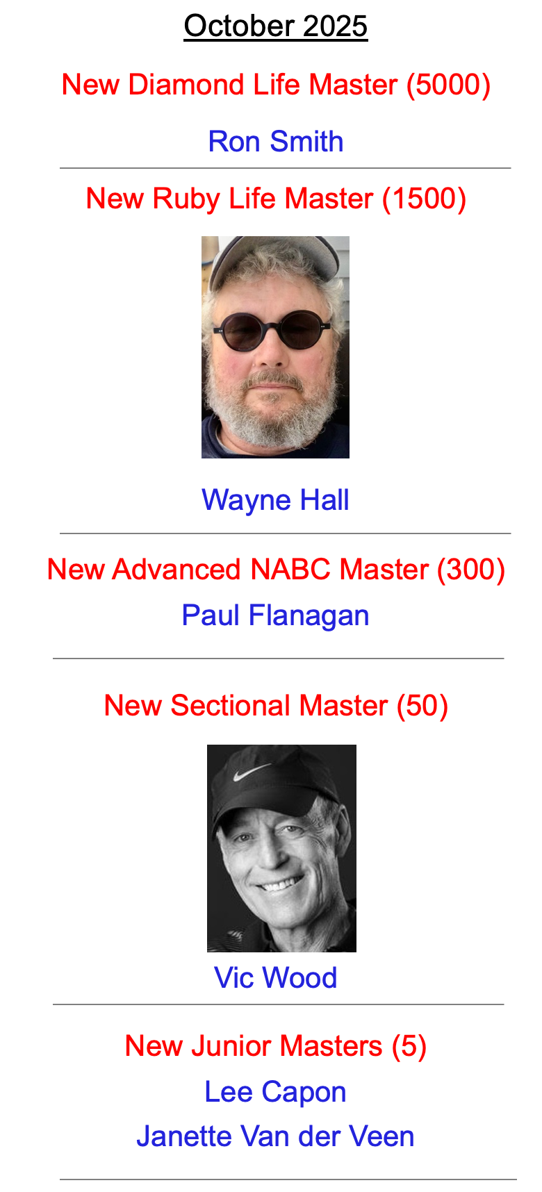 This page keeps a record of Unit 431 members who attain new masterpoint ranks (rank requirement shown in brackets). It is updated monthly and the current year is shown. For older milestones, click on the year of your choice, below.